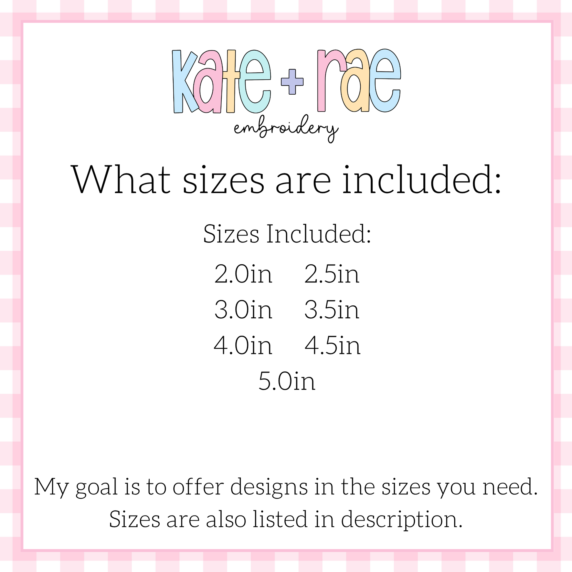 If you would like this design in another size or file extension, please purchase this listing and the "resizing of existing embroidery design" listing. In the comments of your order, please include design name, size requested, and recipient email.