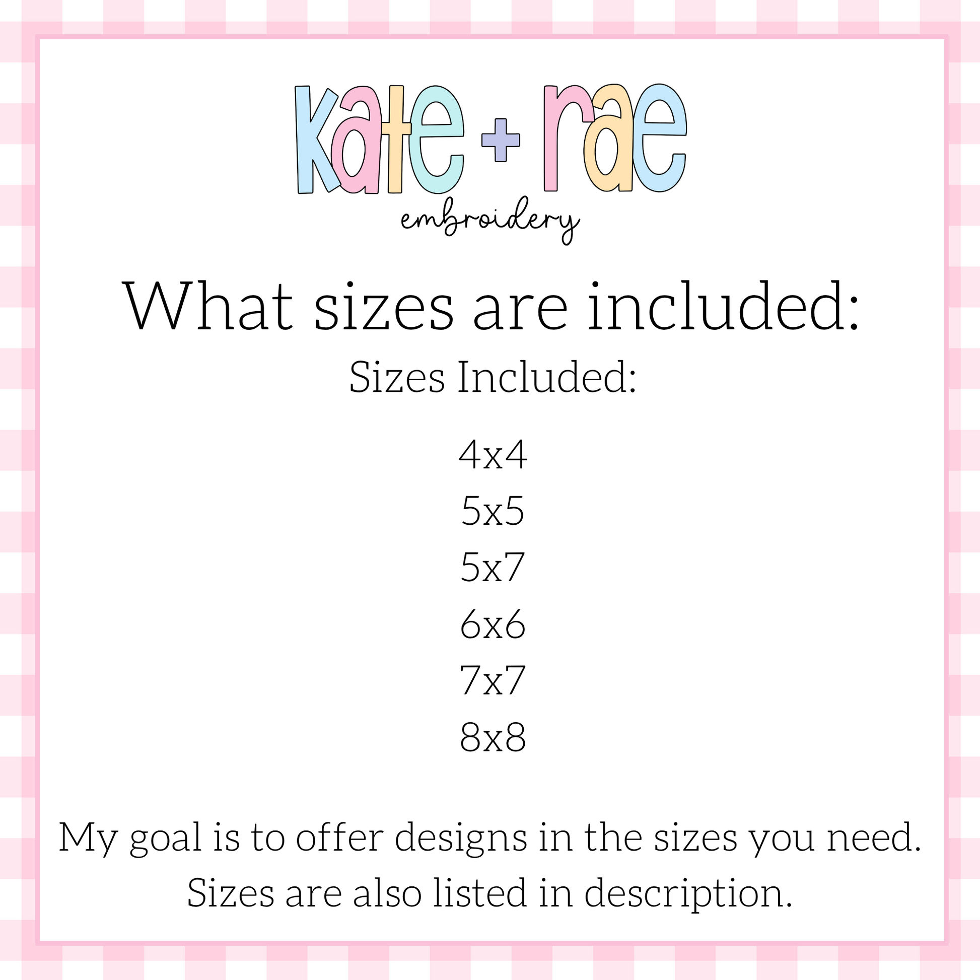 If you would like this design in another size or file extension, please purchase this listing and the "resizing of existing embroidery design" listing. In the comments of your order, please include design name, size requested, and recipient email.