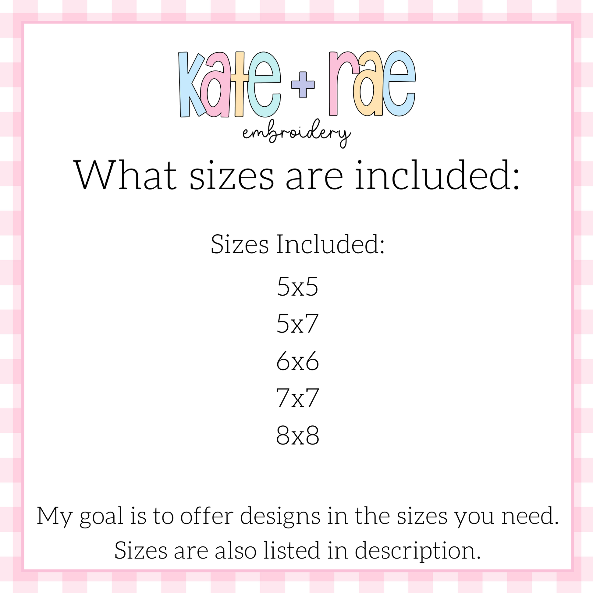 If you would like this design in another size or file extension, please purchase this listing and the "resizing of existing embroidery design" listing. In the comments of your order, please include design name, size requested, and recipient email.