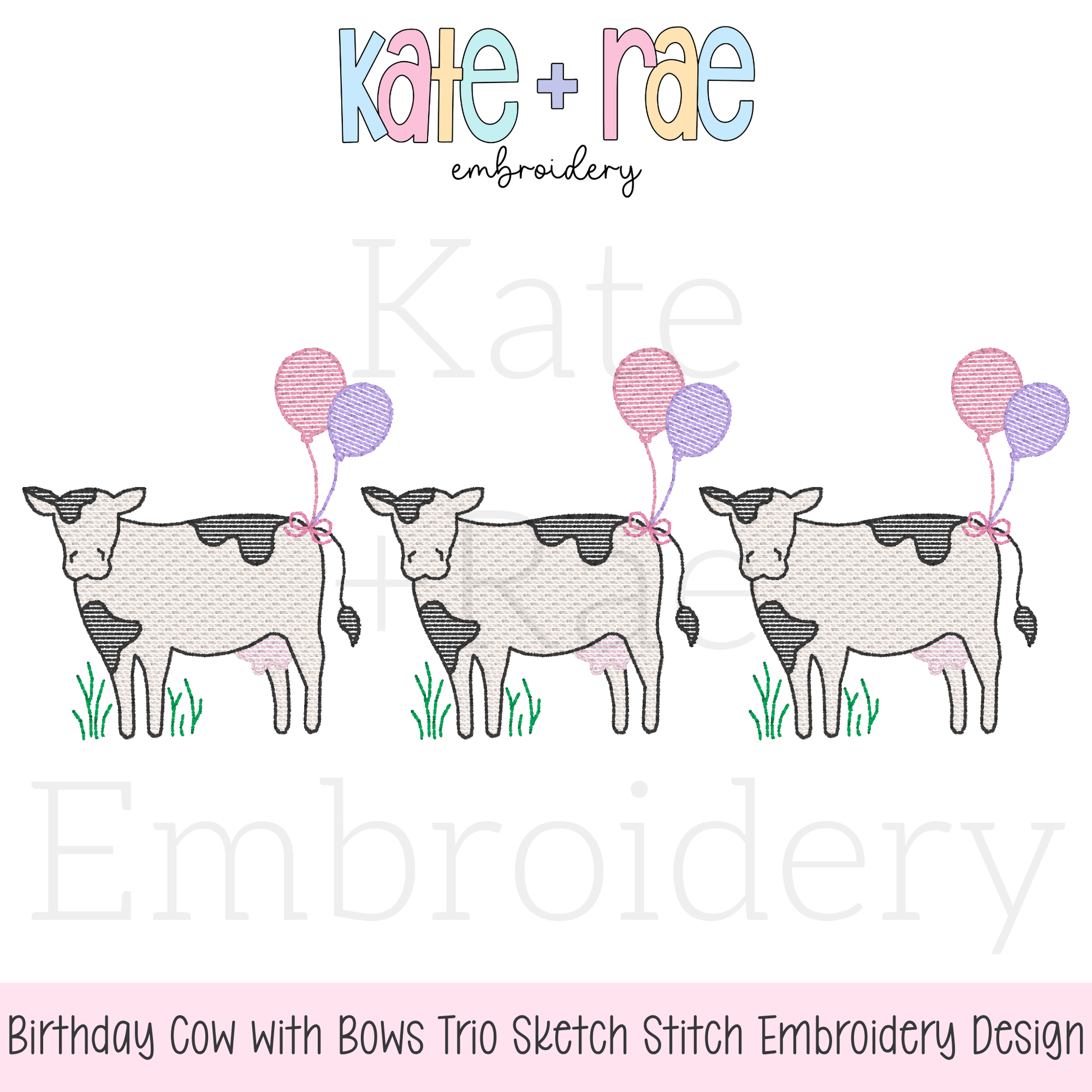 Cow Trio with Bows and Birthday Balloons Sketch Stitch Embroidery Design