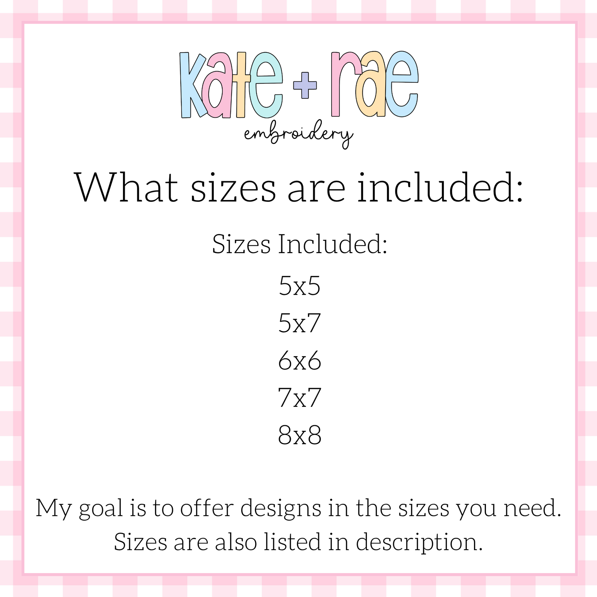If you would like this design in another size or file extension, please purchase this listing and the "resizing of existing embroidery design" listing. In the comments of your order, please include design name, size requested, and recipient email.