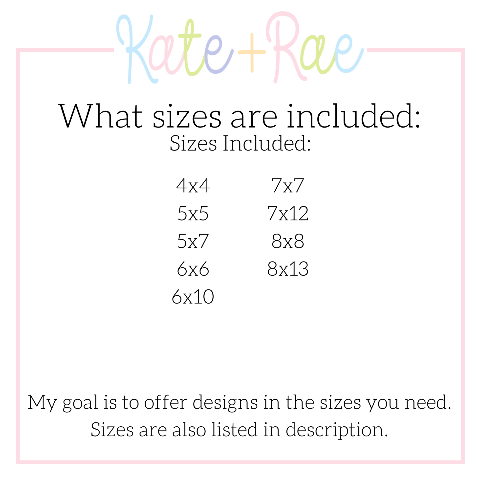 Sizes included: 4x4, 5x5, 5x7, 6x6, 6x10, 7x7, 7x12, 8x8, 8x13