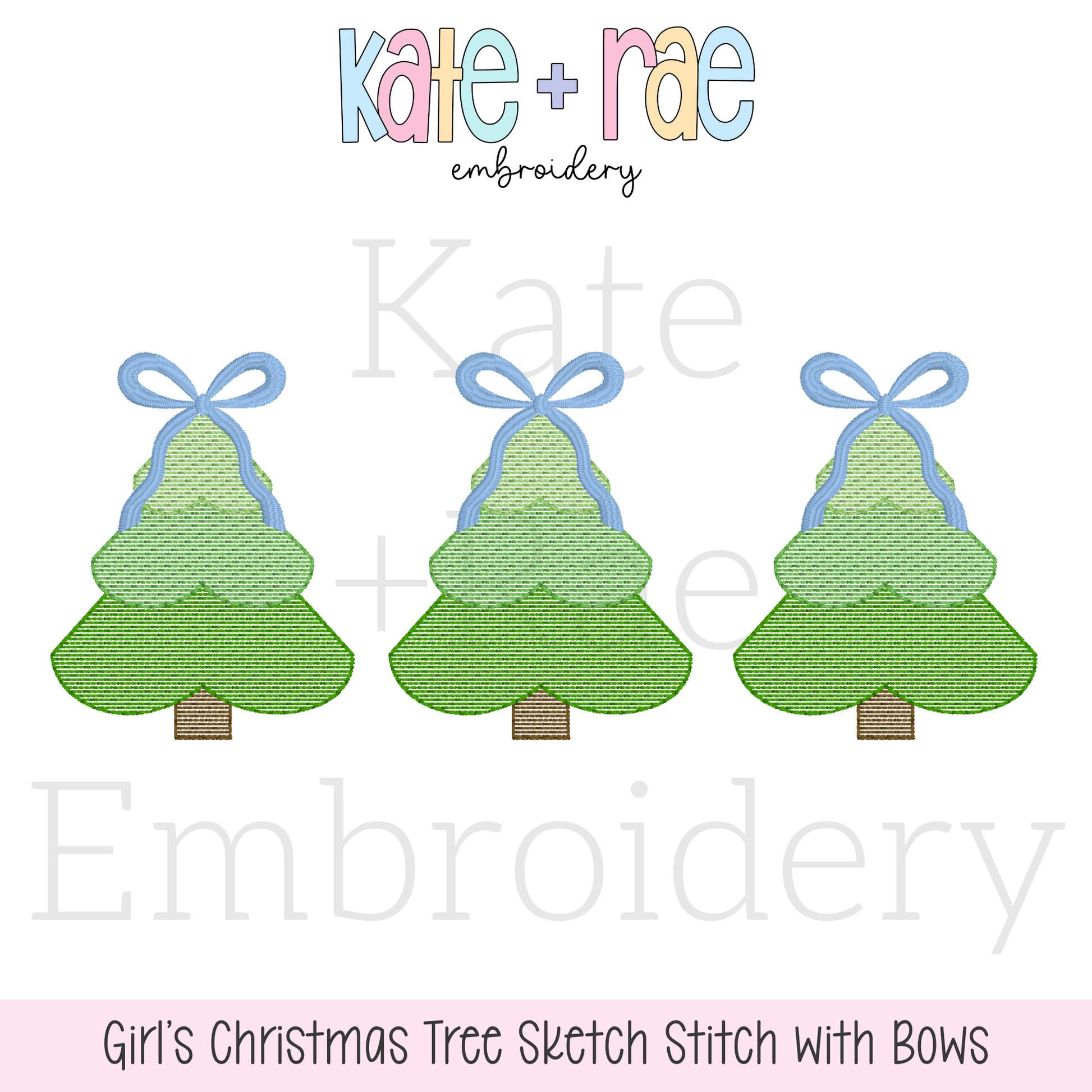 Girls Sketch Stitch Christmas Tree Trio with Bows Embroidery Design