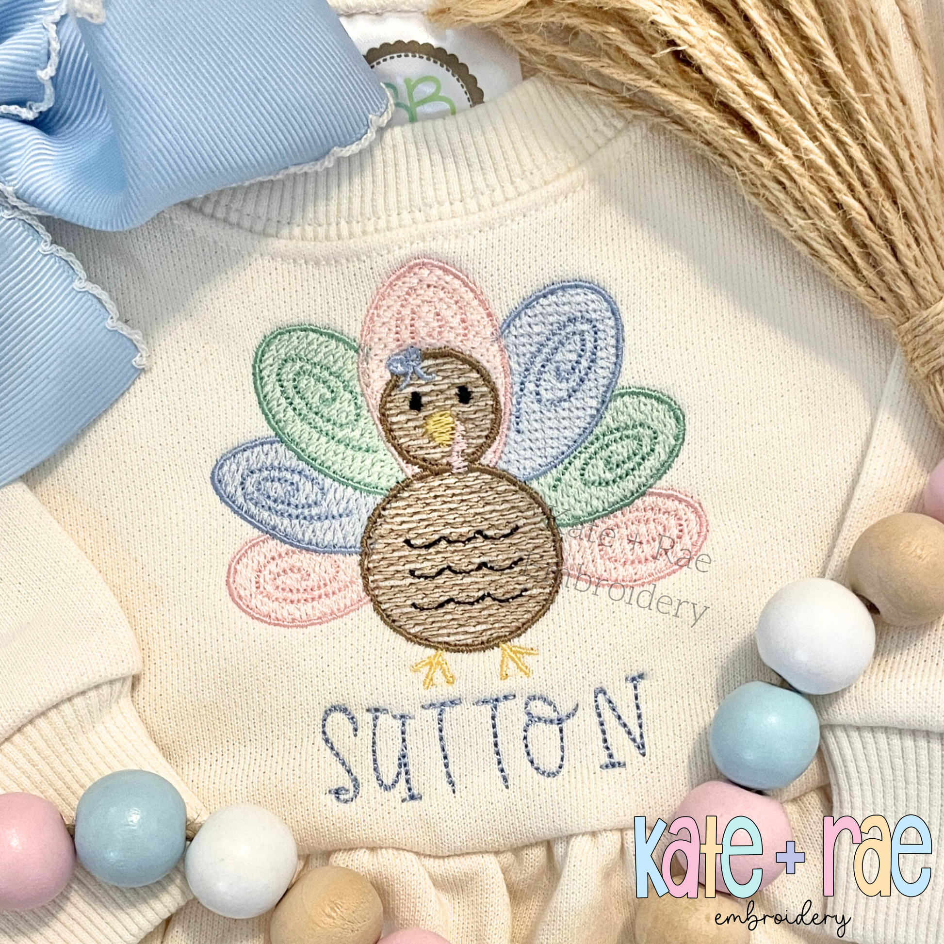 Girl's Thanksgiving Turkey Sketch Stitch with Satin Outline Machine Embroidery Design